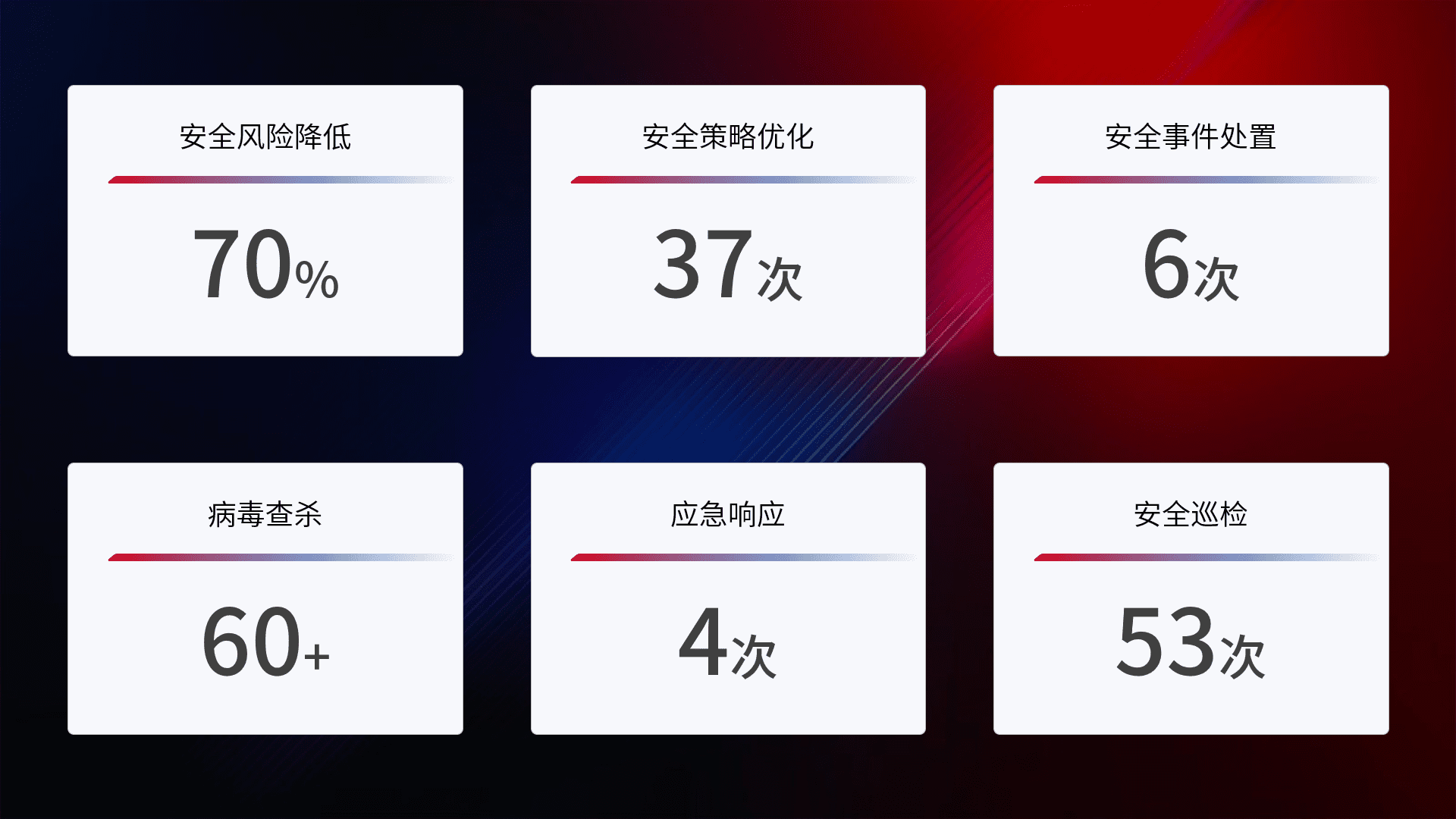 提供全面的安全事件报告体系,,,包括处置报告、、、周报、、、、季度和年度总结,,,结合持续监控,,,帮助客户深入了解网络安全状况。。。
